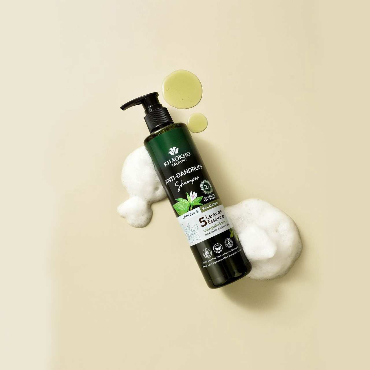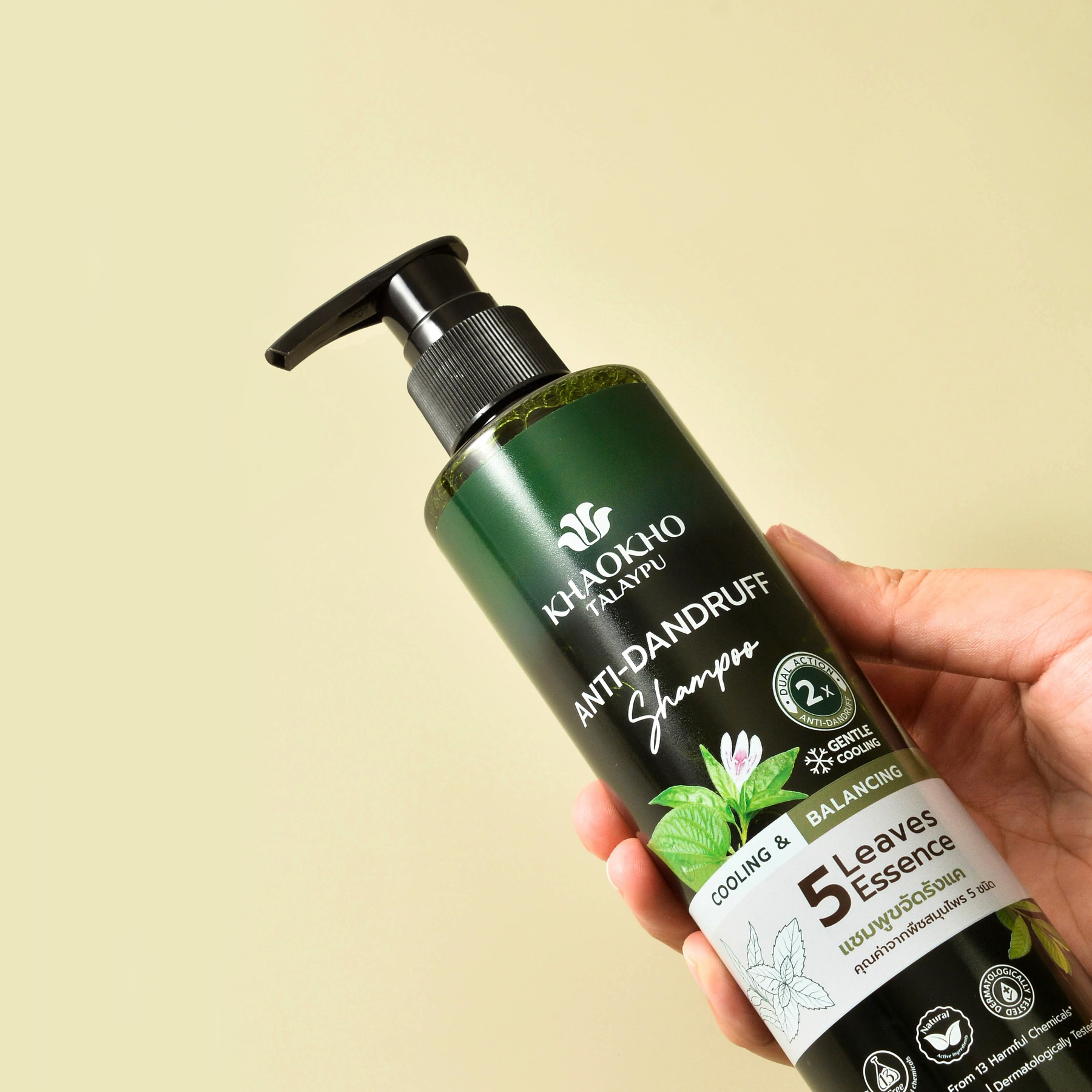Șamponul Khaokho Talaypu Five Leaves Essence Anti-Mătreață ajută la reducerea mâncărimii și a excesului de sebum de pe scalp. Îmbogățit cu ingrediente nutritive precum 5 plante valoroase, inclusiv Andrographis Paniculata, frunză de Neem, frunză de Guava, frunză de Mentă și frunză de Betel, combinate cu tehnologia Duo Action cu Acid Salicilic conținut în microcapsule.Reglează producția de sebum, combate ciupercile scalpului, menține microflora sănătoasă și reduce activitatea bacteriilor patogene, elimină mătreața și mâncărimile pielii. Acesta poate avea un efect de lungă durată, iar Piroctone Olamine ajută la reducerea apariției mătreții pe scalp. Puncte forte ale produsului: Reduce mâncărimea, elimină mătreața vizibilă de la prima utilizare. Reduce excesul de sebum. Gata să ofere prospețime și să reabiliteze echilibrul scalpului. 5 plante medicinale: – Andrographis paniculata ajută la reducerea acumulării de bacterii. – Frunzele de Neem ajută la eliminarea mătreții. Hrănește scalpul pentru a-l hidrata și ajută la reducerea iritației scalpului. – Frunzele de Guava ajută la hrănirea părului pentru a fi sănătos și strălucitor și controlează excesul de sebum de pe scalp. – Frunza de Betel ajută la reducerea acumulării de bacterii și reduce iritația scalpului. – Frunzele de mentă ajută la eliminarea mătreții. și reduce iritația scalpului. Special cu o ușoară răcoare, nu irită și nu ustură scalpul, oferă îngrijire eficientă pentru păr și scalp, părul devine puternic, strălucitor și mătăsos. Ingrediente active: piroctonolamină, mentol, acid citric și salicilic, extracte de neem, mentă, andrographis, betel și guava.